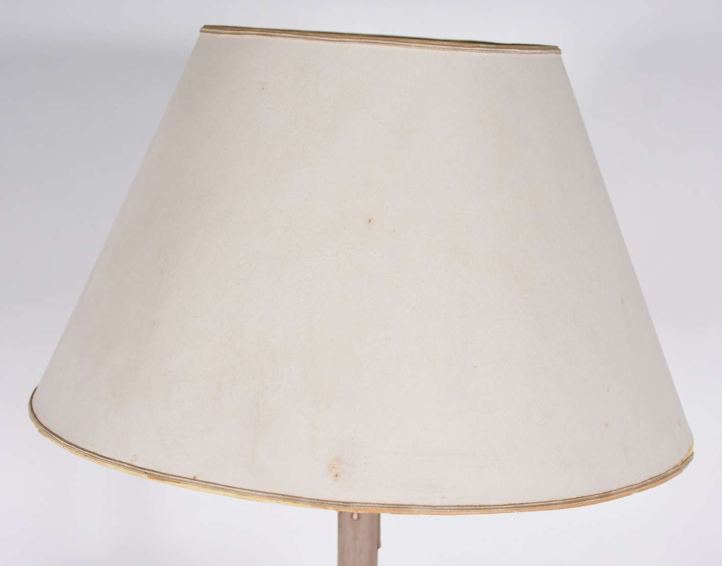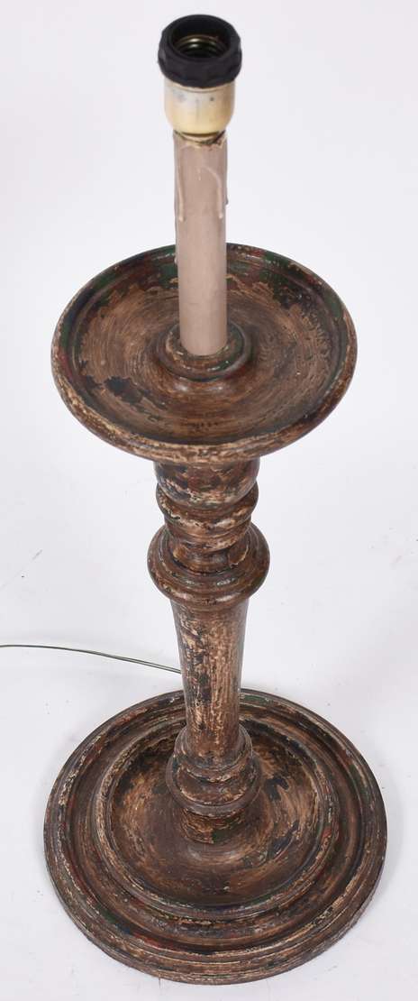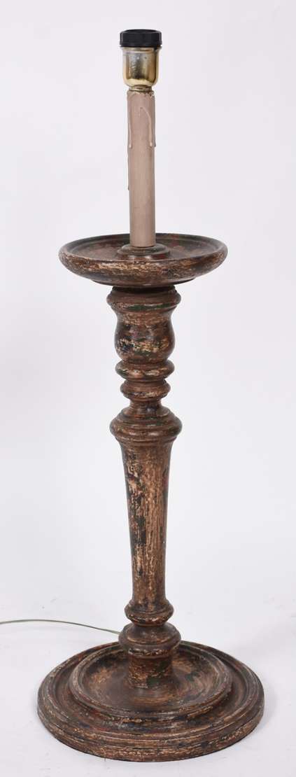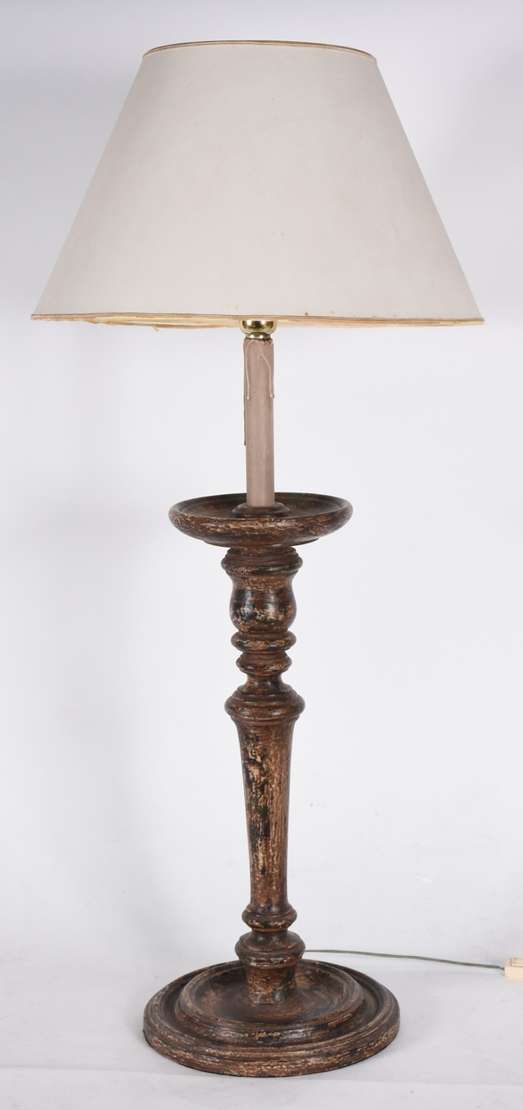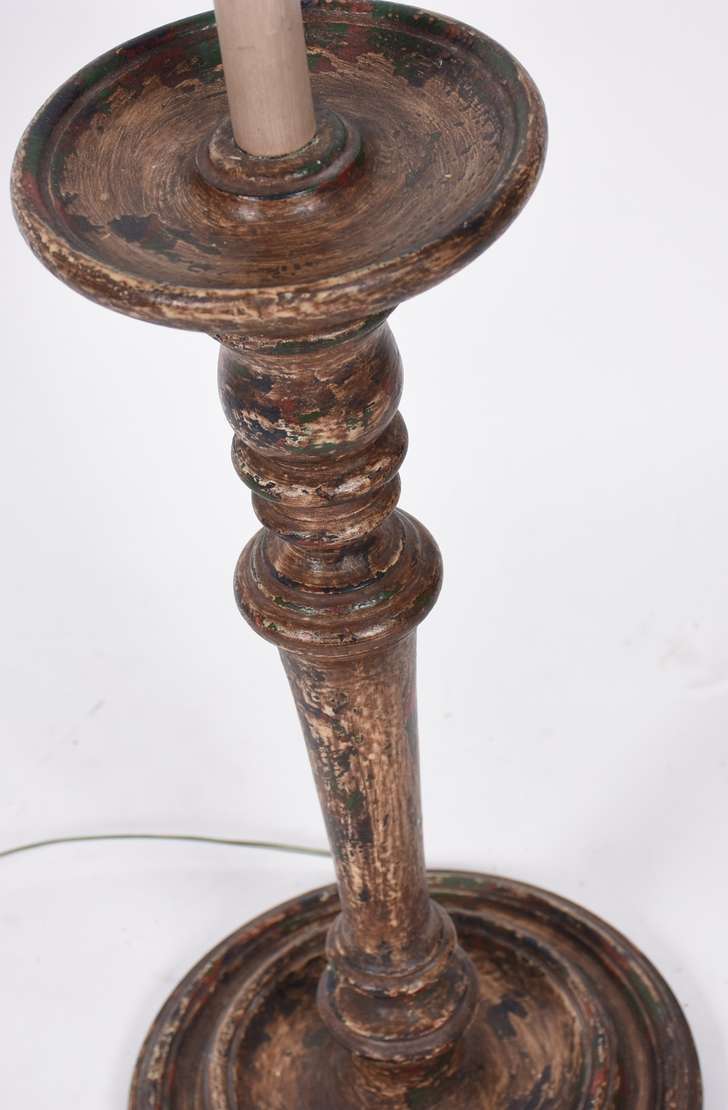 Abatjour de madeira patinada, acompanha cúpula branca.
