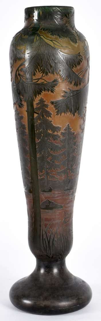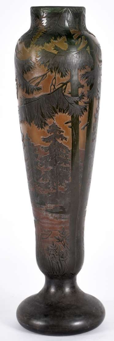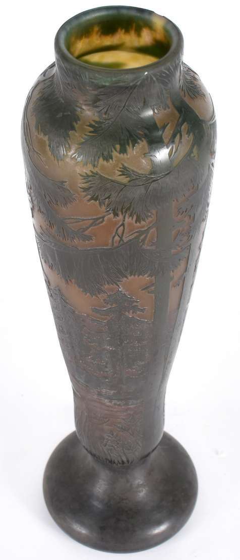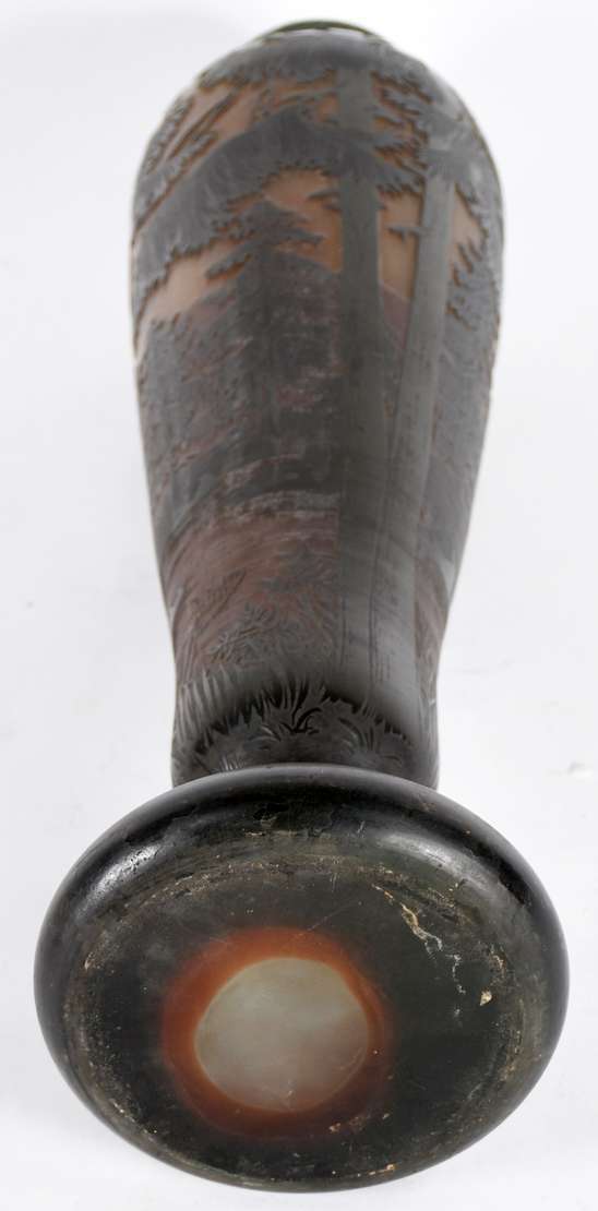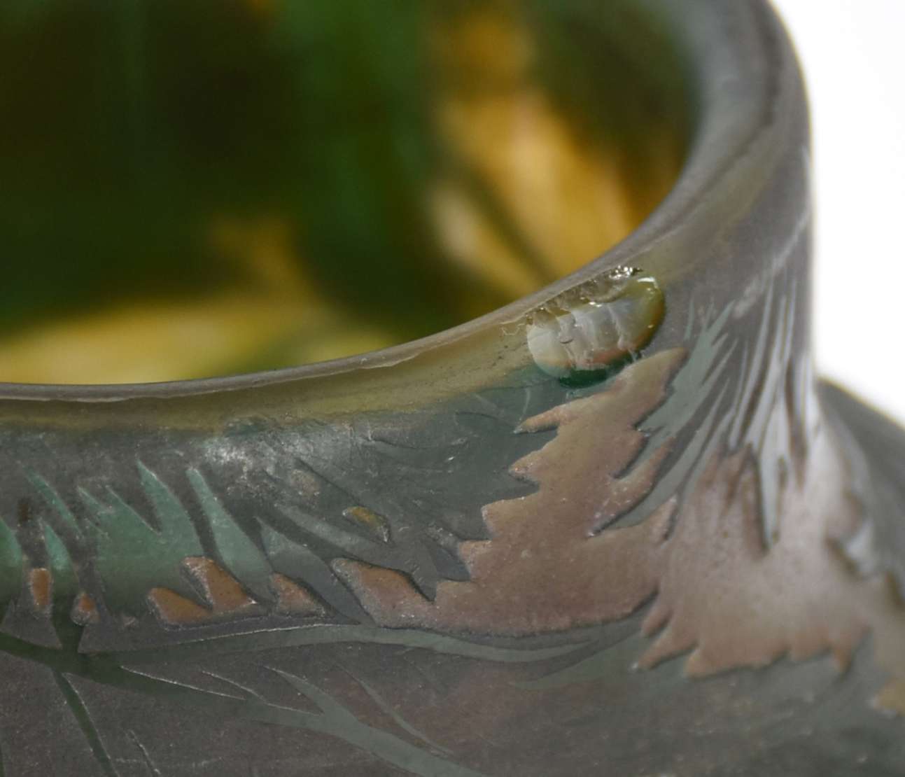 Cachepot com paisagem de vidro policromado, bordas em frisos.