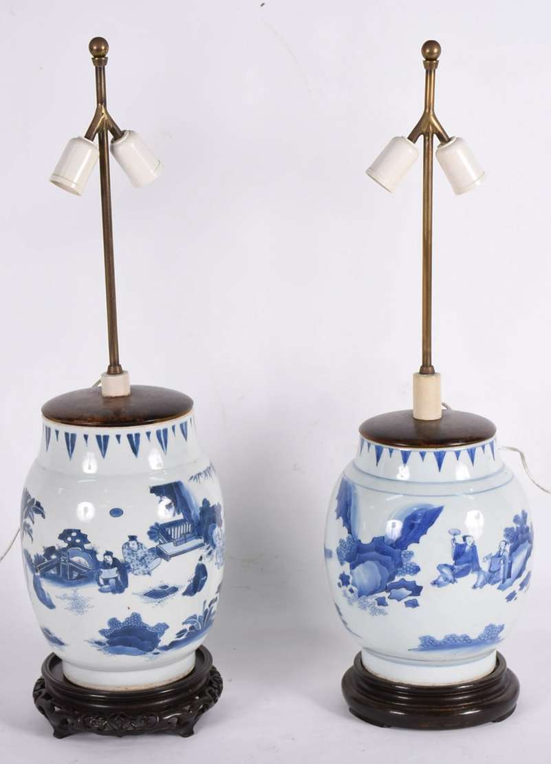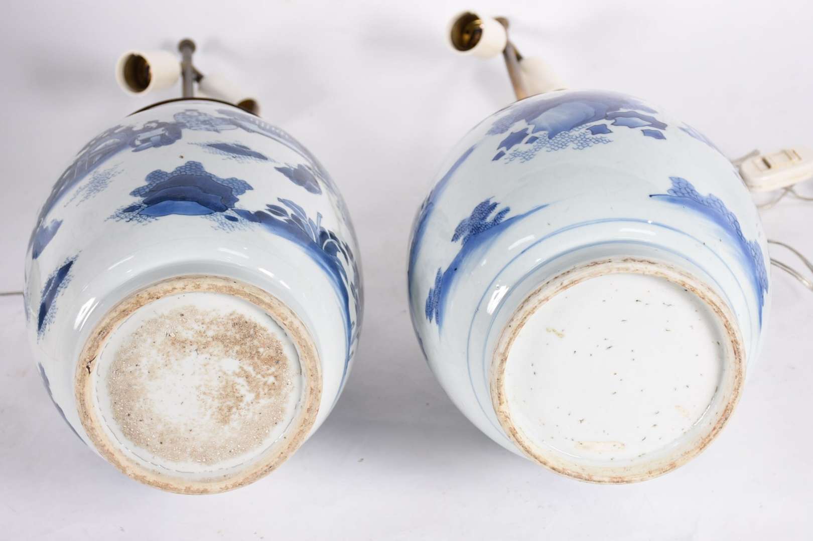 Par de abatjoures de porcelana chinesa em tons de azul, um deles com restauro. Século XIX.