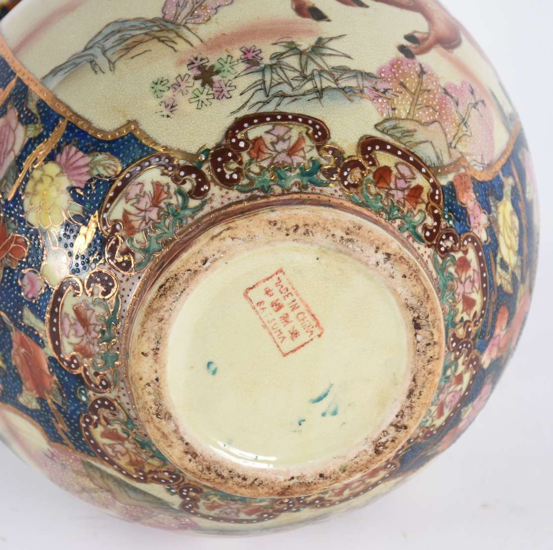 Vaso de porcelana oriental marrom decorado com flor em policromia.