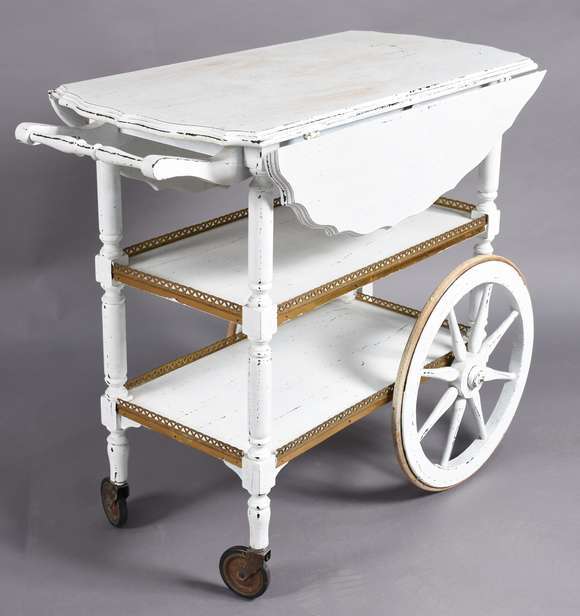 Carrinho de chá de madeira patinada de branco, com rodinhas.