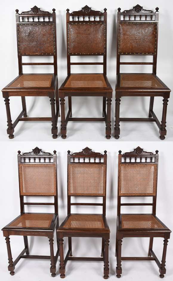 Seis cadeiras de madeira sendo 3 com encosto de palhinha e 3 com encosto de couro, assento de palhinha.