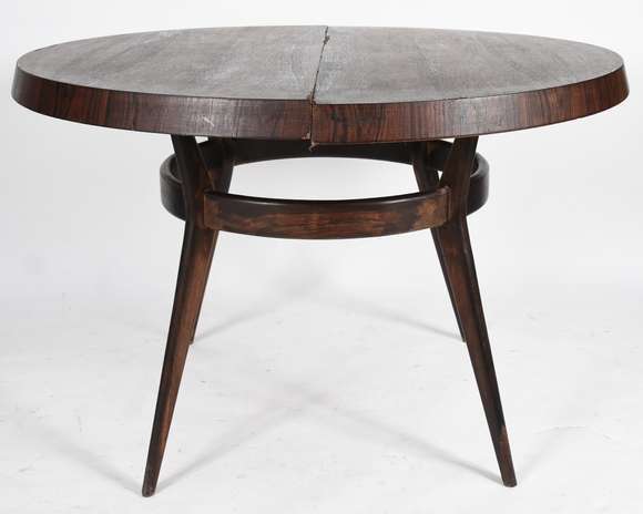 Mesa de jantar em madeira folheada de jacarandá, tábua extensora (med.38 cm), feitio redondo. Quatro pés feitio palit...
