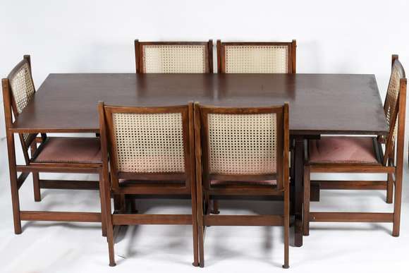 Mesa de jantar de madeira nobre, tampo retangular com pernas retas duplas terminando com um pé para cada lado, unidas...