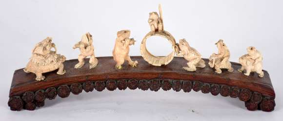 Diversas peças de marfim representando animais com base de madeira entalhada (alguns colados).