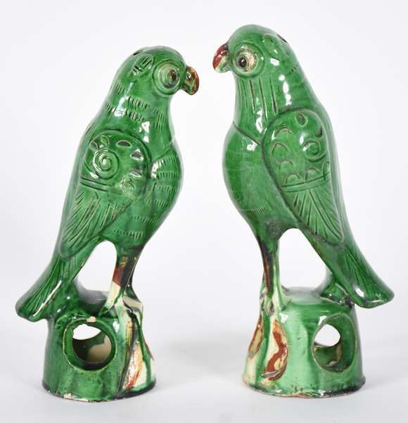 Três esculturas diversas, sendo 2 de biscuit policromado representando pássaros e animais e outra de terracota na for...