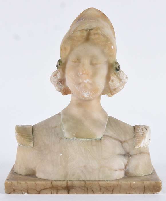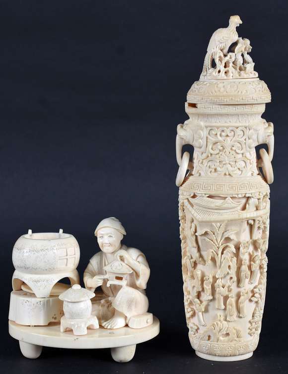 Duas estatuetas de marfim, sendo um vaso trabalhado com figuras e aves em relevo (pequena parte faltando na borda) e,...