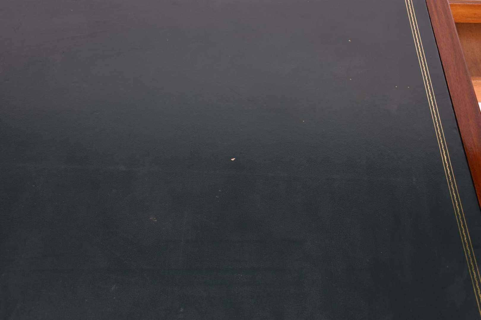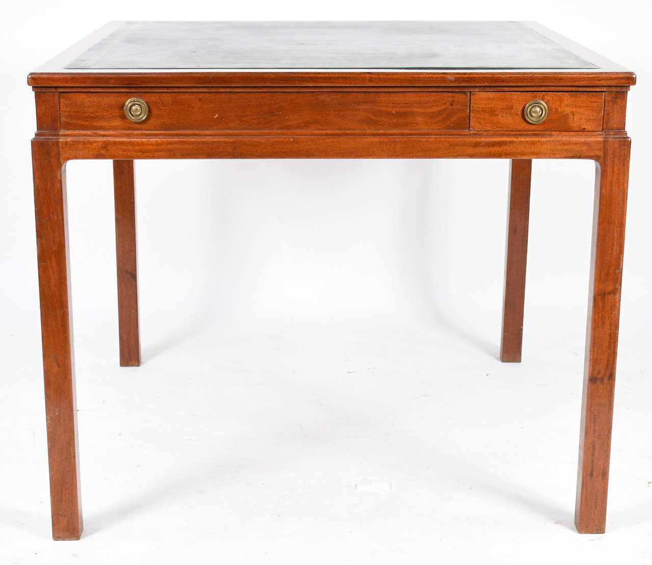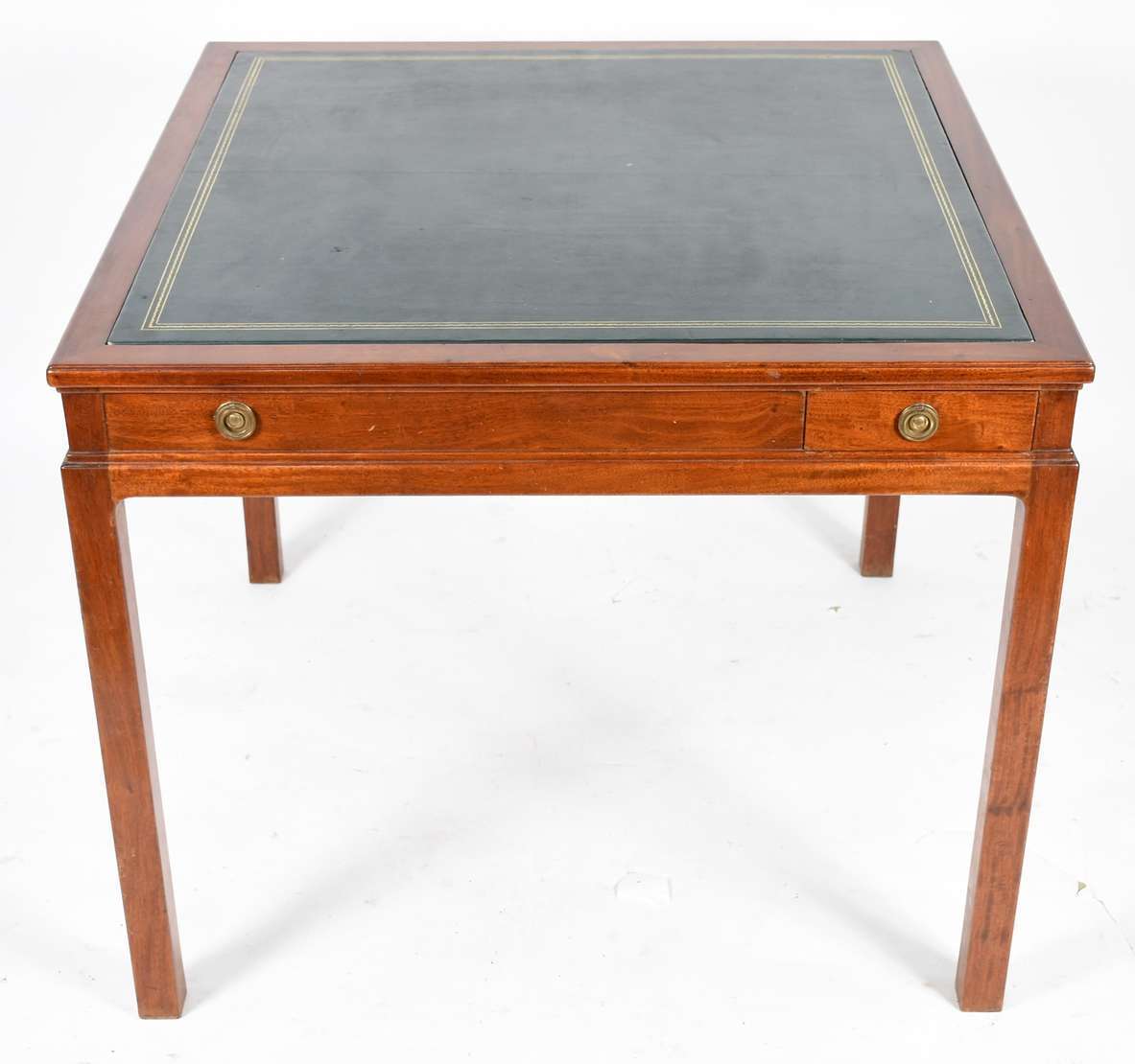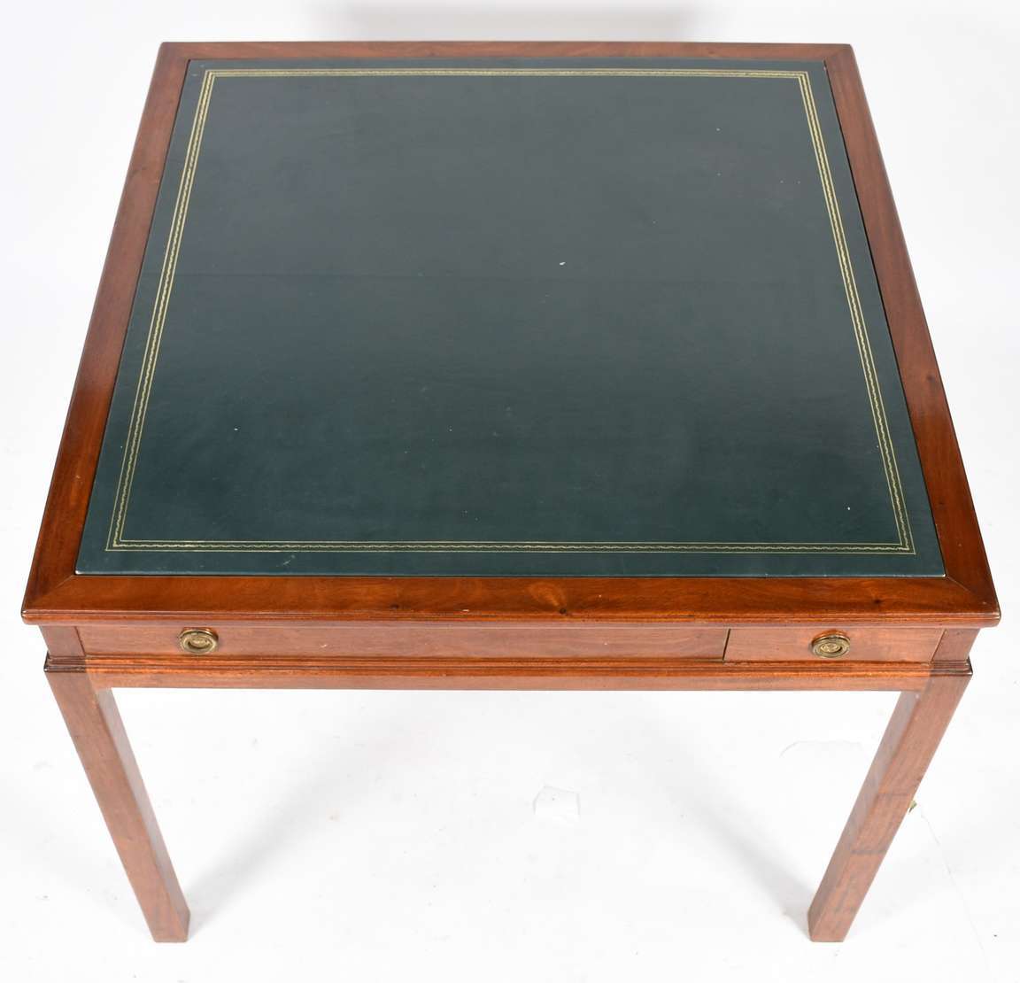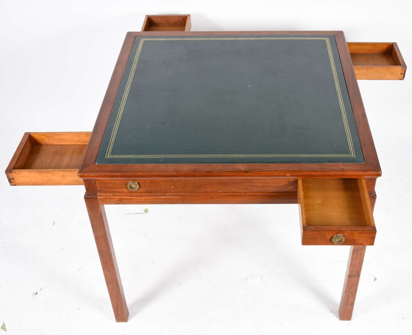 Mesa de jogo de madeira nobre, tampo de couro, gavetinhas laterais.