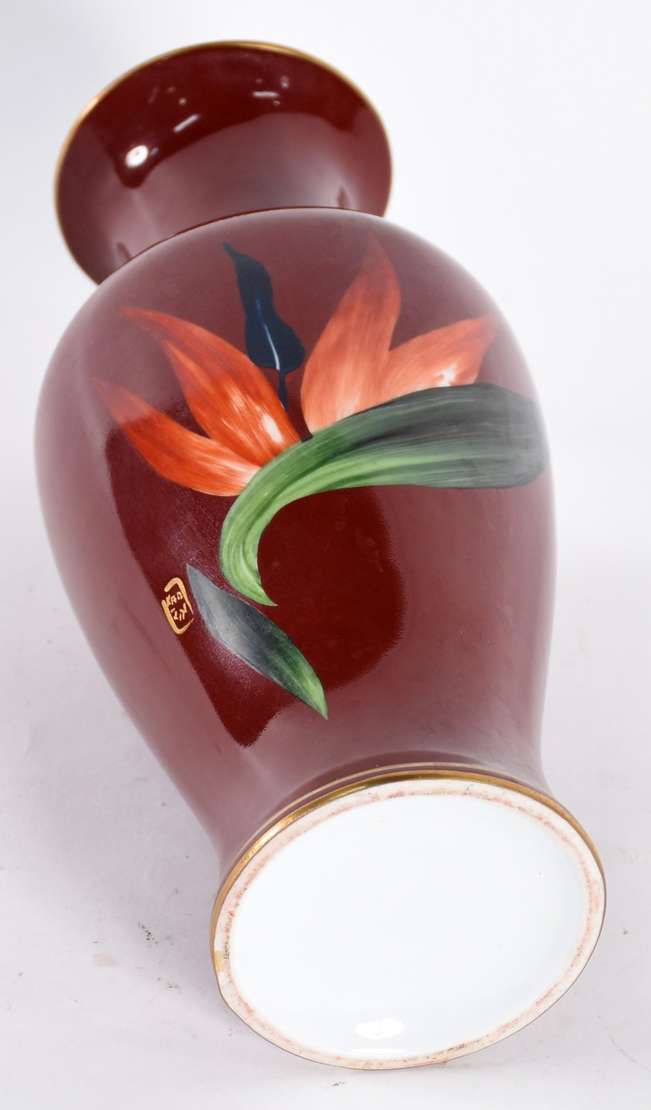 Vaso de opalina na cor bege decorado com pássaro e flores em policromia, borda feitio babado (um dente da borda quebr...