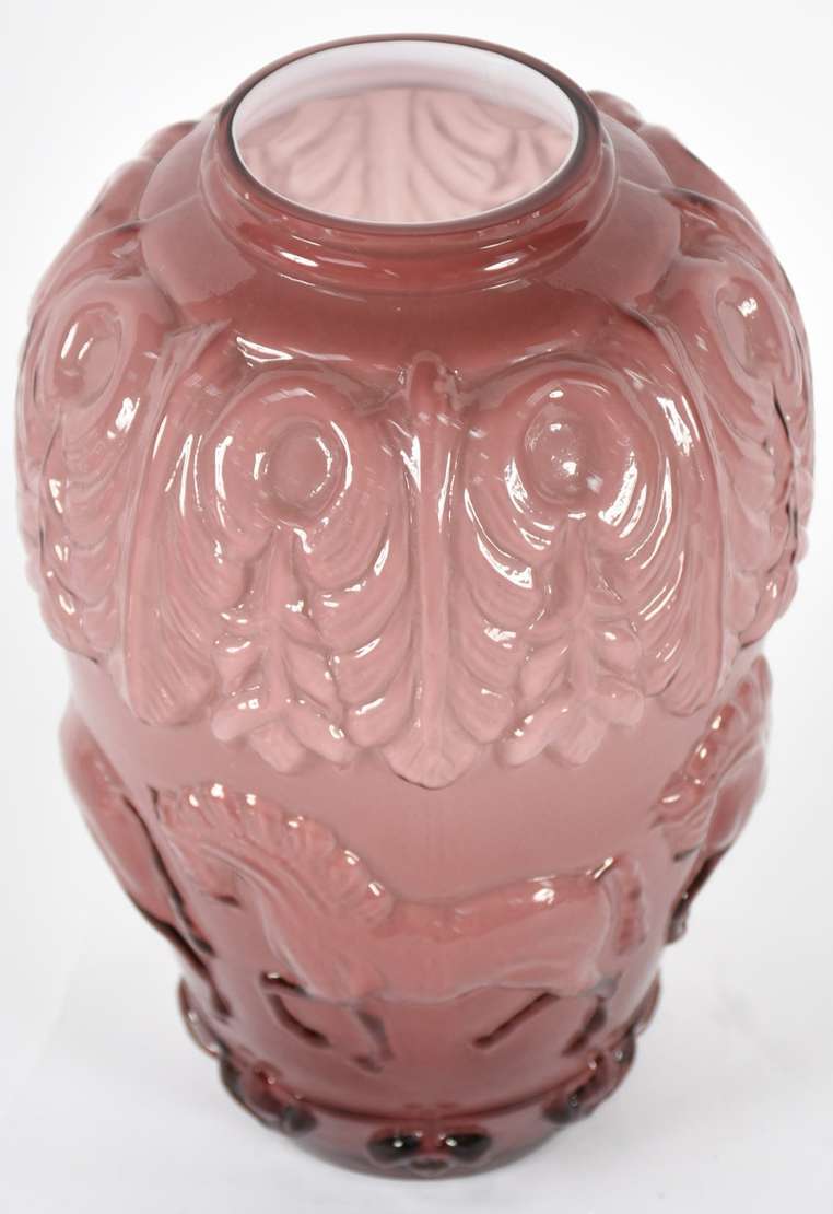Dois vasos decorativos de vidro, sendo um amarelo com rosas em relevo e outro na cor lilás com pássaros em relevo.