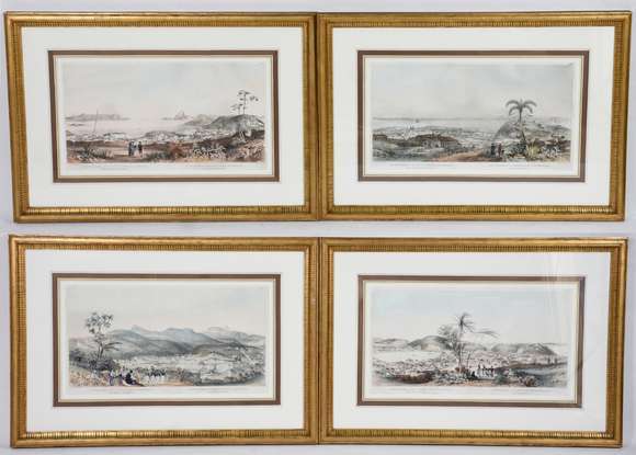 Belíssimo conjunto de quatro antigas gravuras inglesas com cenas da cidade do Rio de Janeiro. Medida externa com mold...