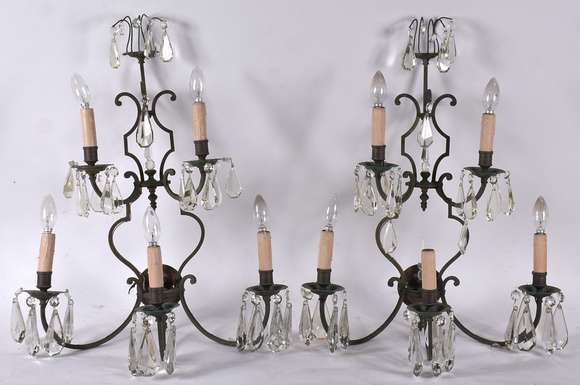 Par de apliques, para 5 luzes com pingentes de cristal.