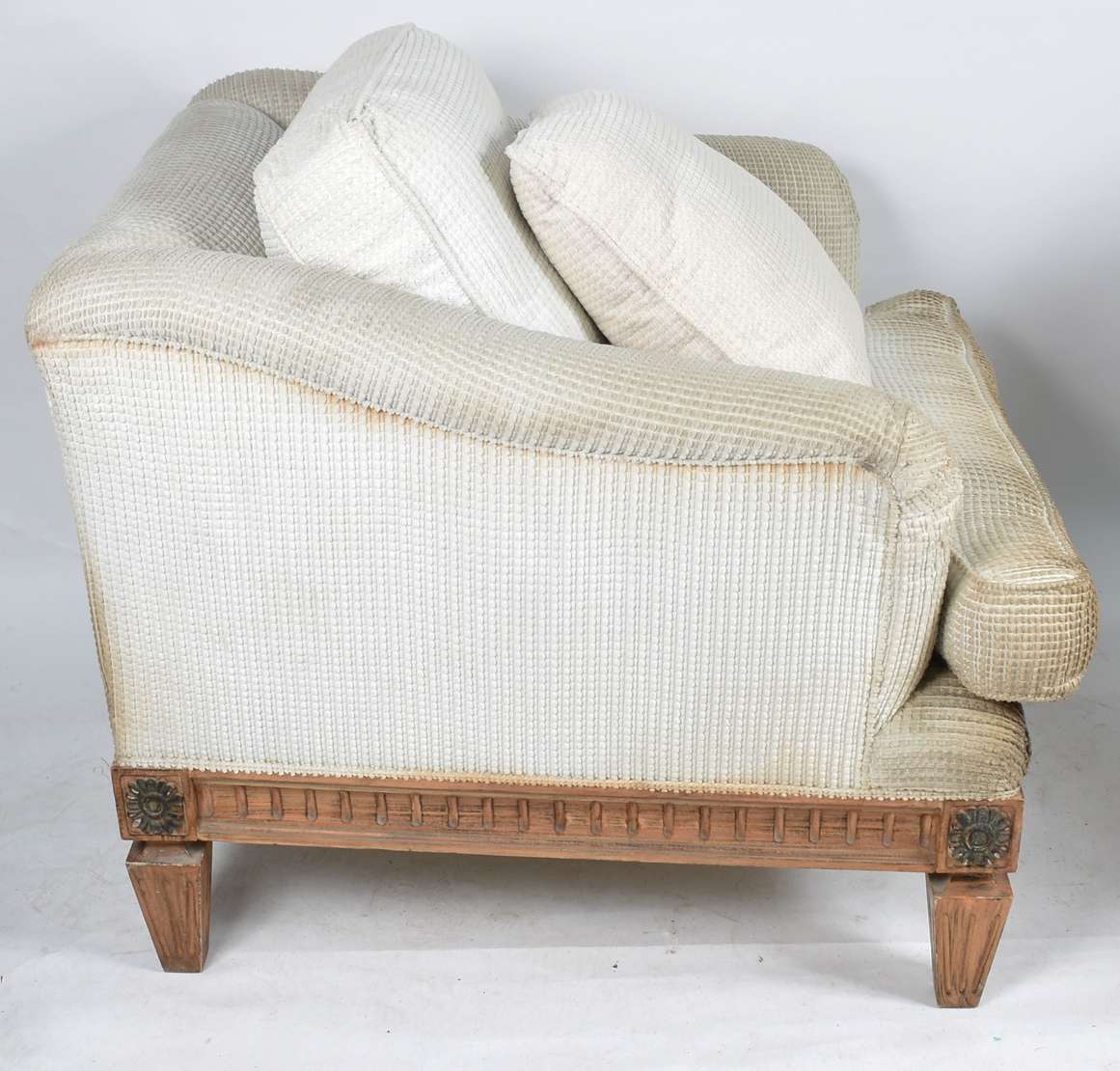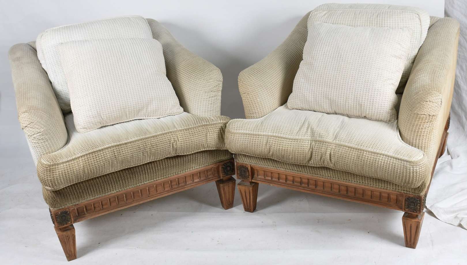 Três cadeiras de madeira nobre, pernas frontais cilíndricas e frisadas, assentos e encostos estofados e forrados com ...