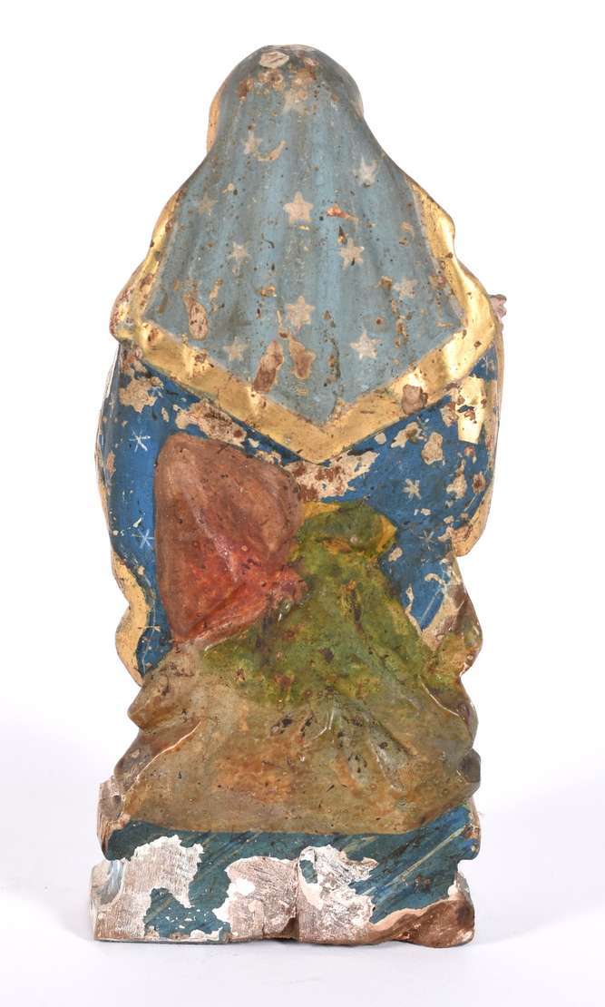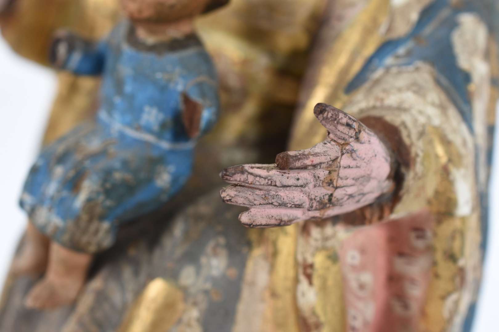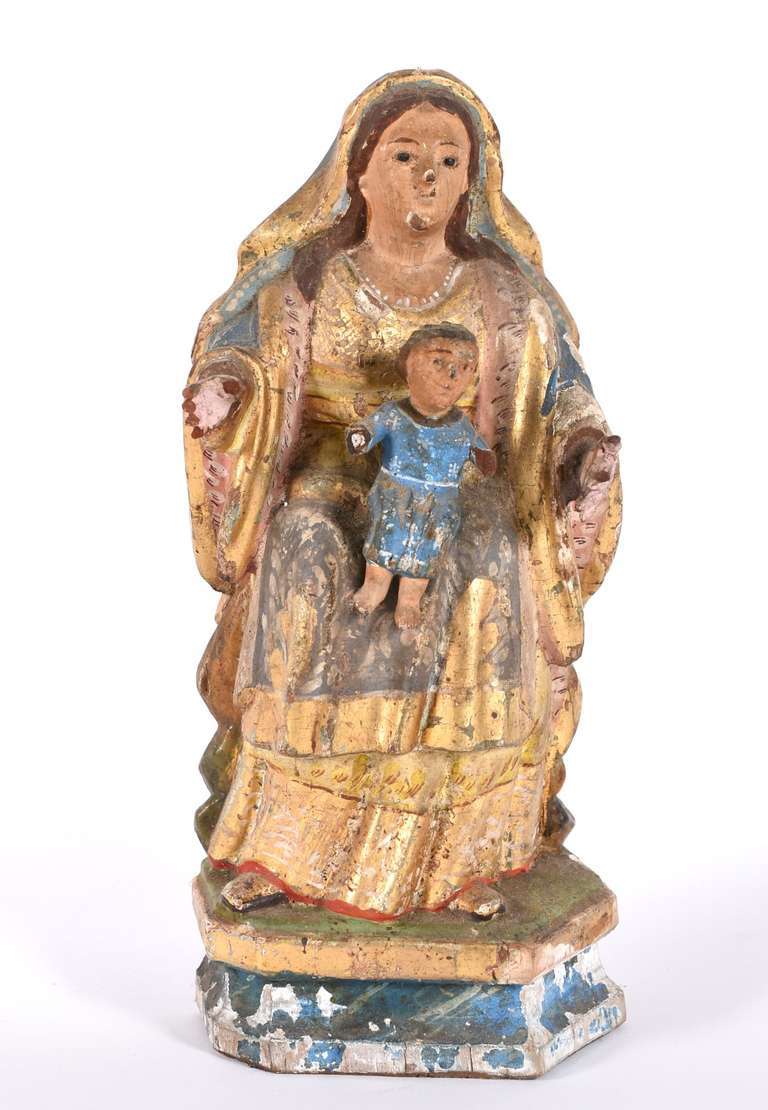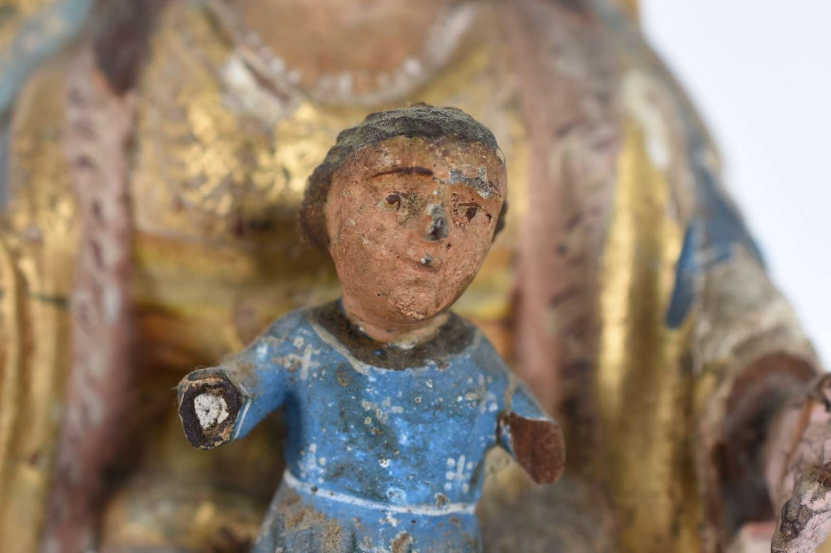 Imagem de Nossa Senhora com menino de madeira policromada e dourada (desgastes).