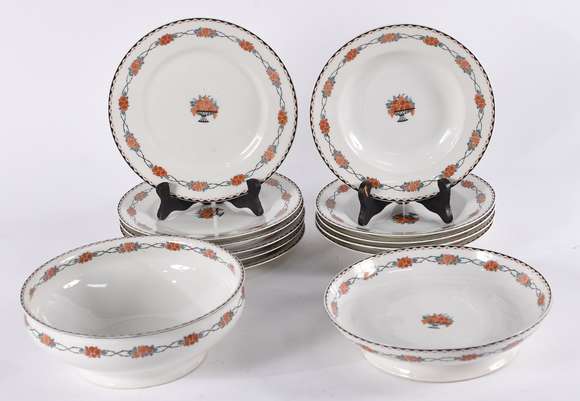 Parte de serviço de porcelana francesa GEO. ROUARD composto de: 6 pratos rasos ( com bicado), 5 pratos fundos, um bow...