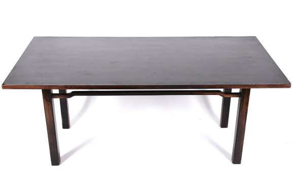 Mesa de madeira nobre feitio retangular, pernas retas (tampo com desgastes).