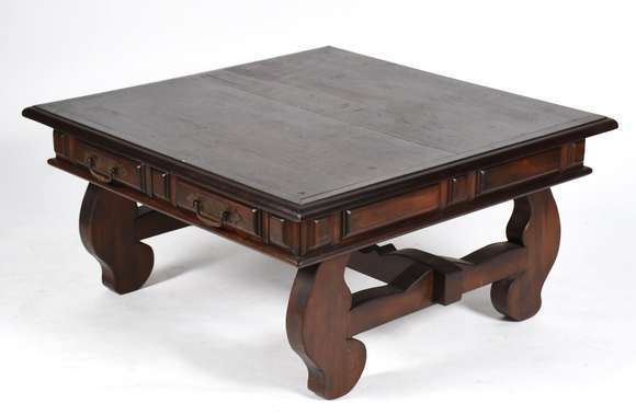 Mesa de centro de madeira nobre estilo colonial brasileiro com 2 gavetas e laterais almofadadas, pernas arqueadas lig...