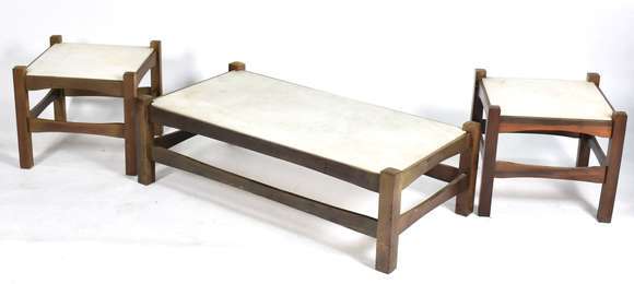 Conjunto de 3 mesas de madeira nobre com tampos de mármore, sendo 1 de centro e par de laterais. Anos 60. Selo na ba...