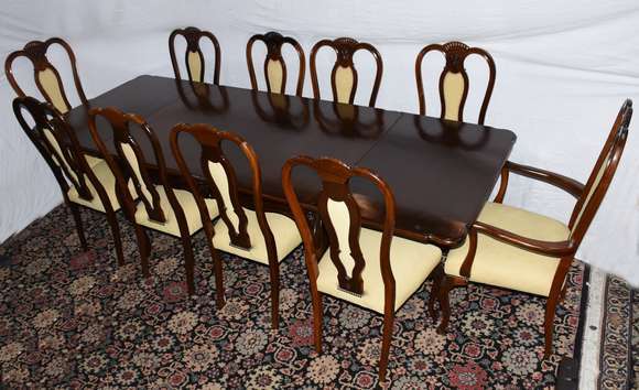 Mesa de jantar de madeira nobre estilo Luis XV, feitio retangular com 2 tábuas extensoras laterais que quando fechada...