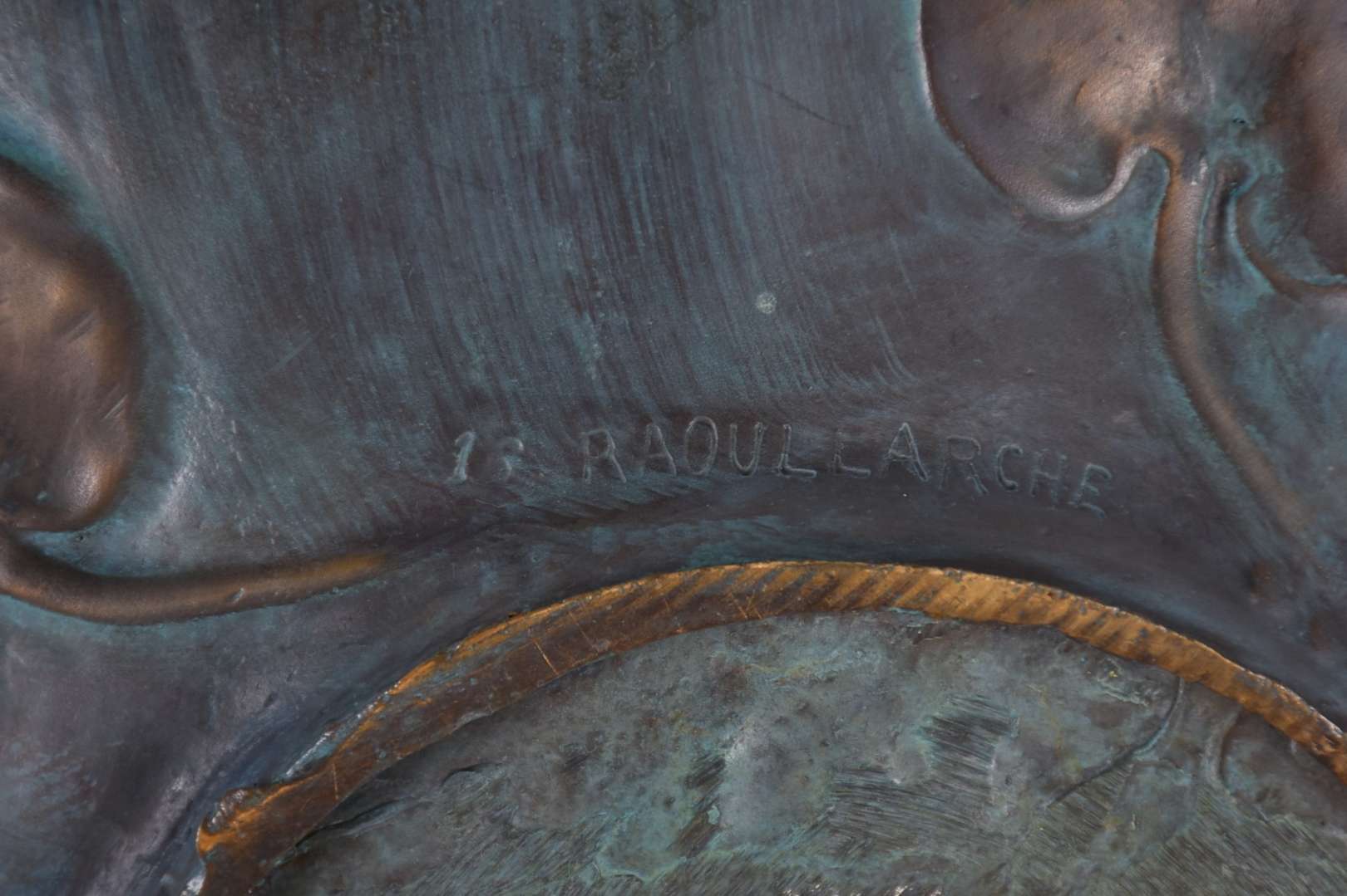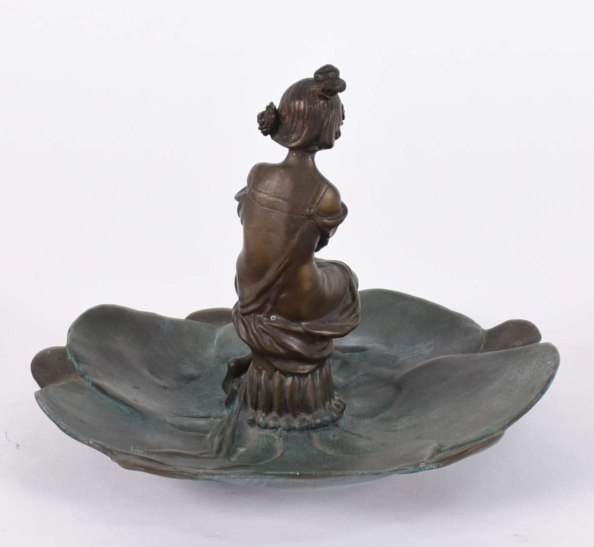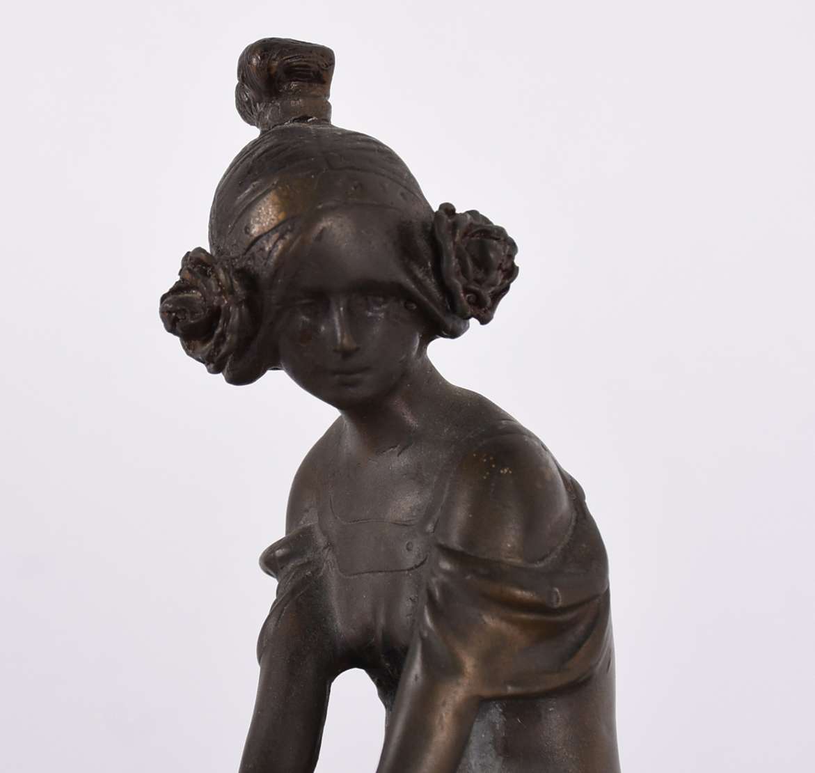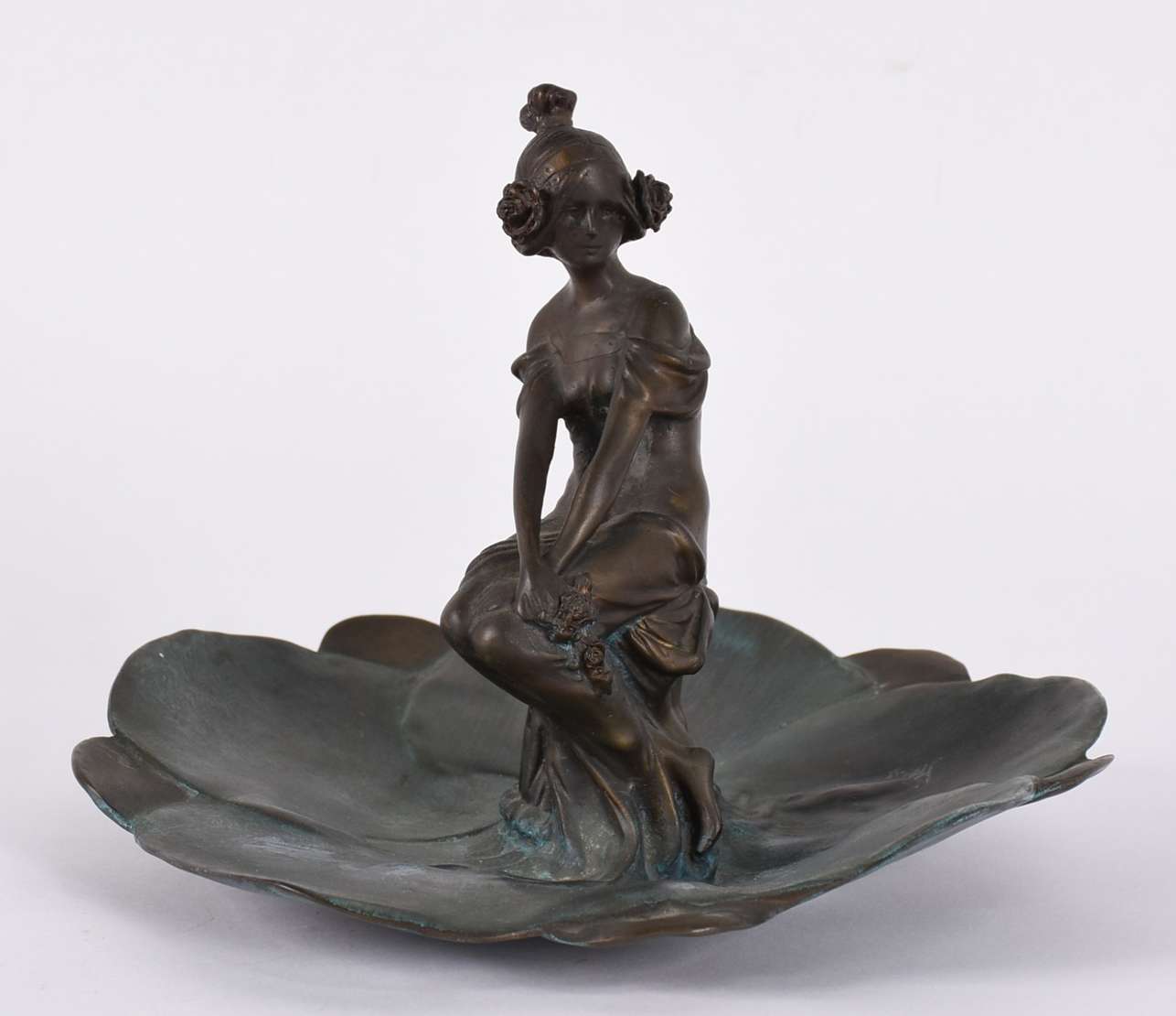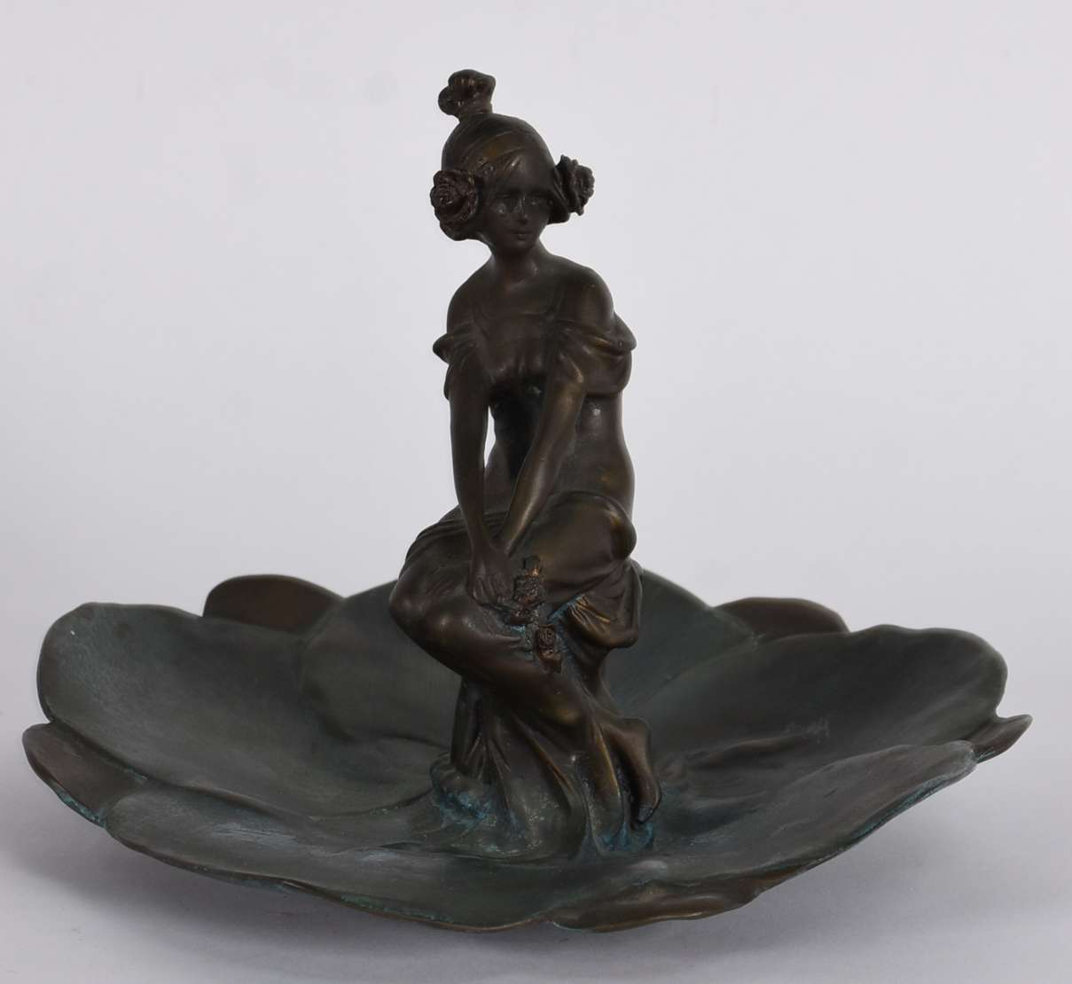 Escultura de porcelana representando figura feminina com cesto de flores.