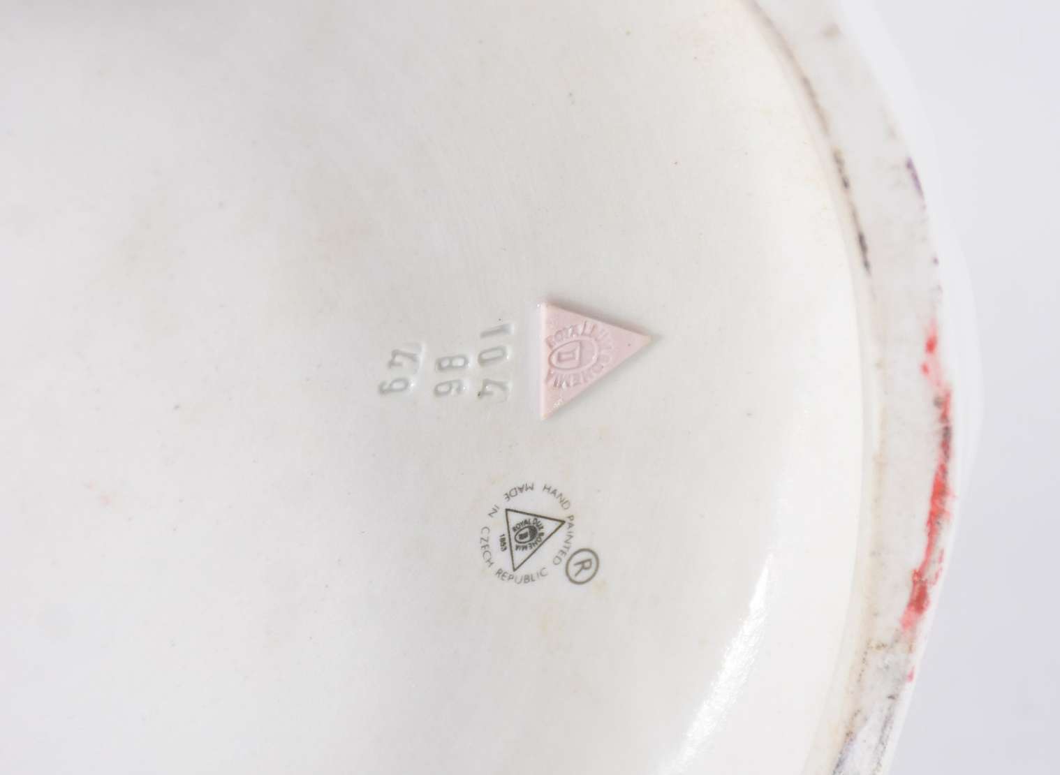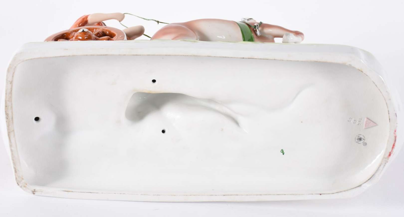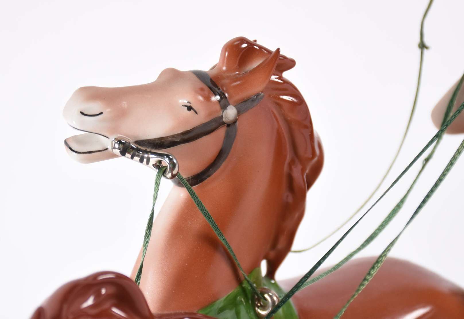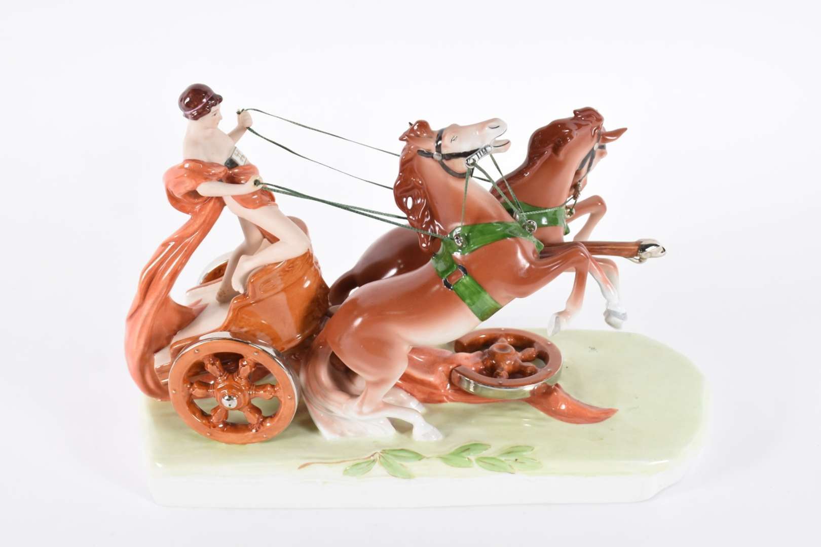 Grupo escultórico de porcelana tcheca policromada Royal Dux representando Figura conduzindo Biga. Marcas do fabricante na base.