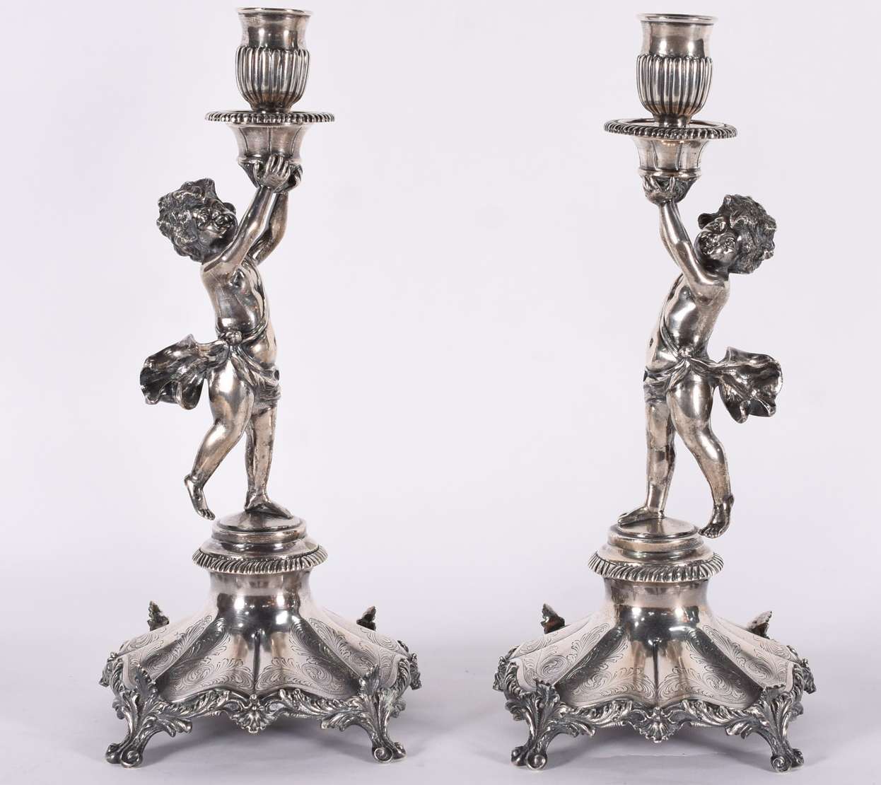 Par de grandes tocheiros de madeira entalhada com bobeches de metal.
