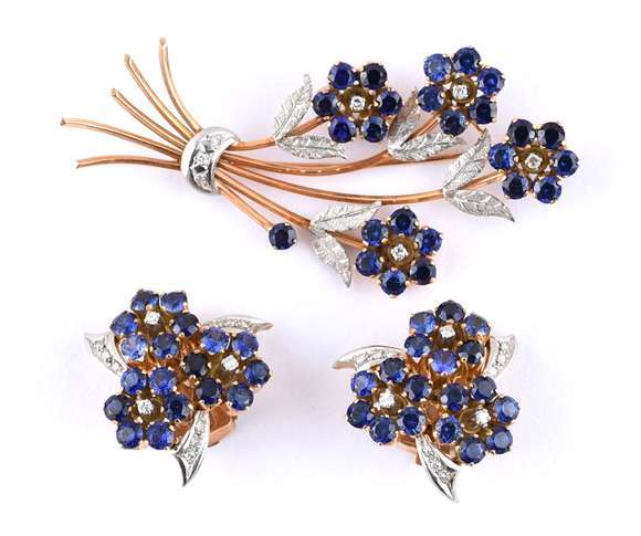 Conjunto de ouro 18 k e platina composto de broche e par de brincos de pressão feitio flores com pedras azuis (fech...