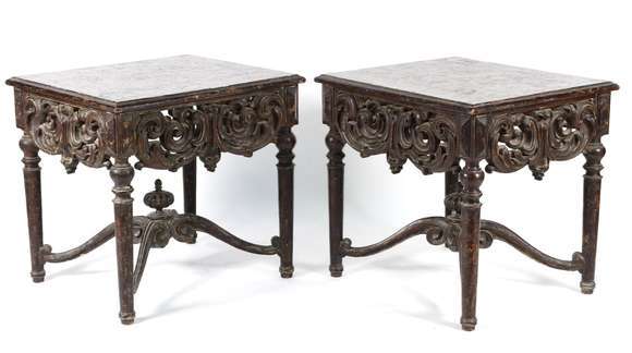 Par de antigas mesas laterais de madeira nobre, saias ricamente entalhadas, pernas cilíndricas ligadas por traves inf...