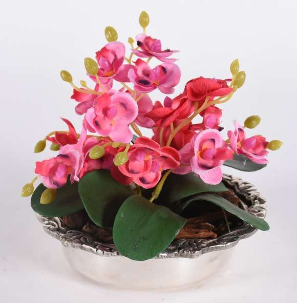 Pequeno cachepot de metal prateado com composição de orquídeas permanentes.