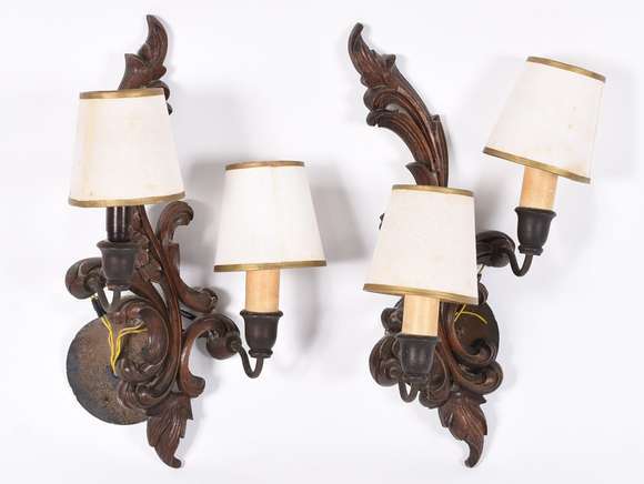 Par de apliques de madeira entalhada para duas luzes cada.