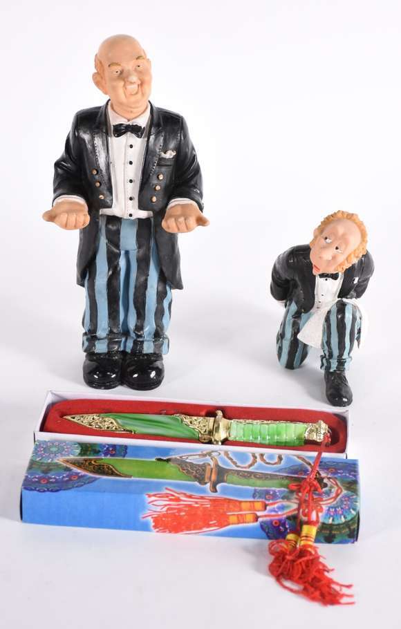Três peças diversas, sendo faca com bainha e duas esculturas de resina representando garçons.