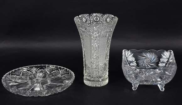Três peças de cristal lapidado, sendo vaso, fruteira e porta petiscos.