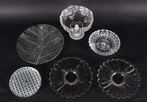 Seis peças de vidro diversos, sendo fruteira, prato, par de pratos, prato tijolinho e porta petiscos.