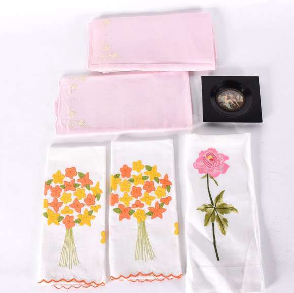 Seis guardanapos de linho com flores bordadas (moledos diferentes); e pintura sobre celulose.