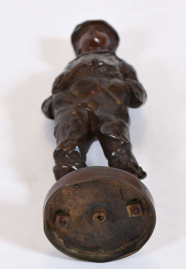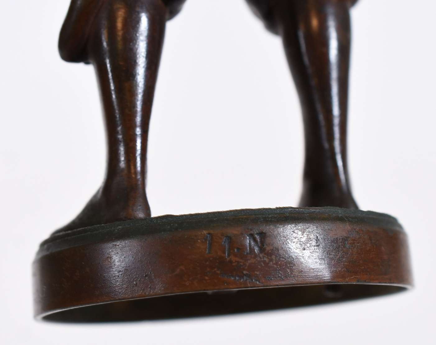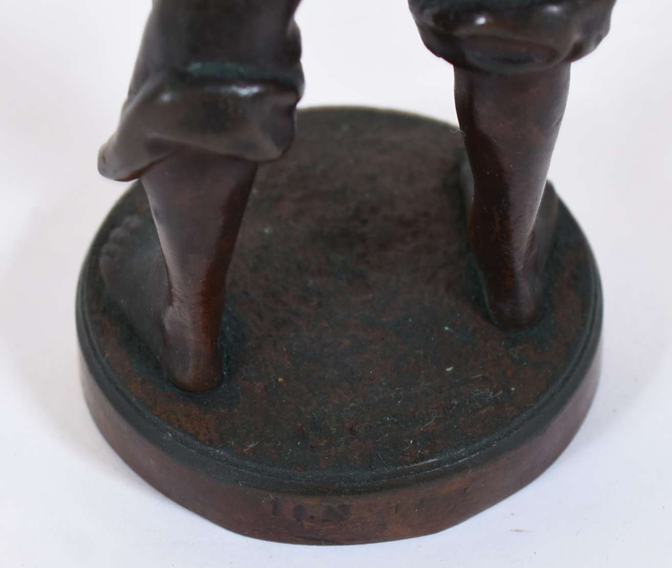 Escultura de petit bronze representando Militar a cavalo, base de madeira com desgastes na pátina.