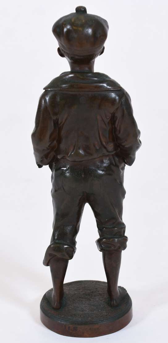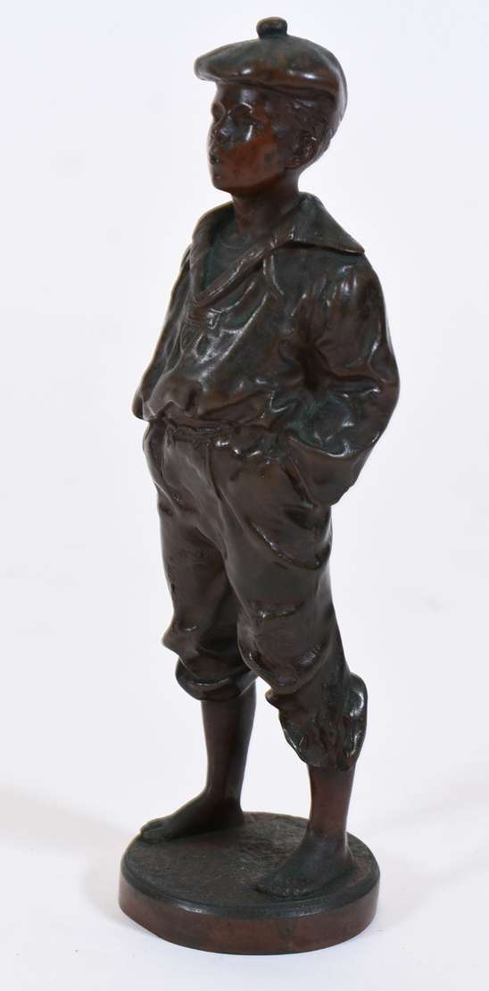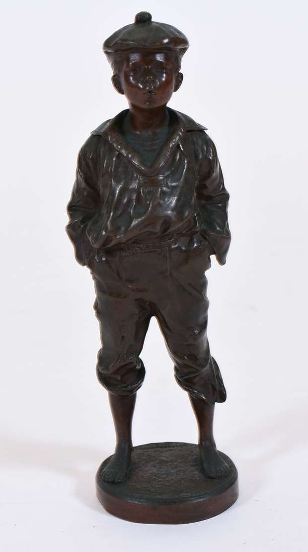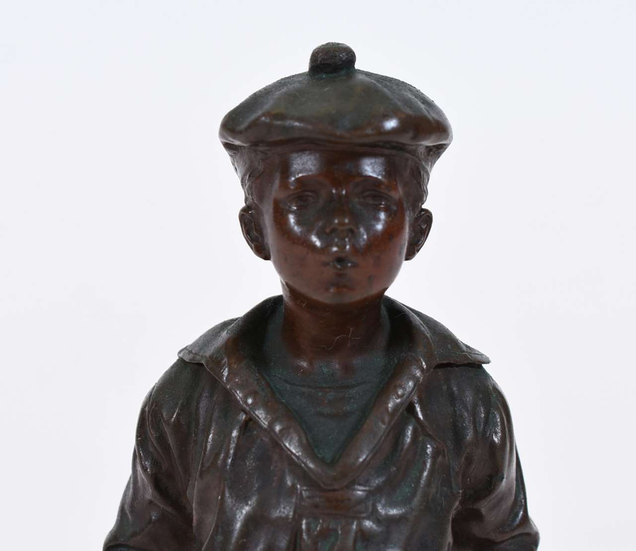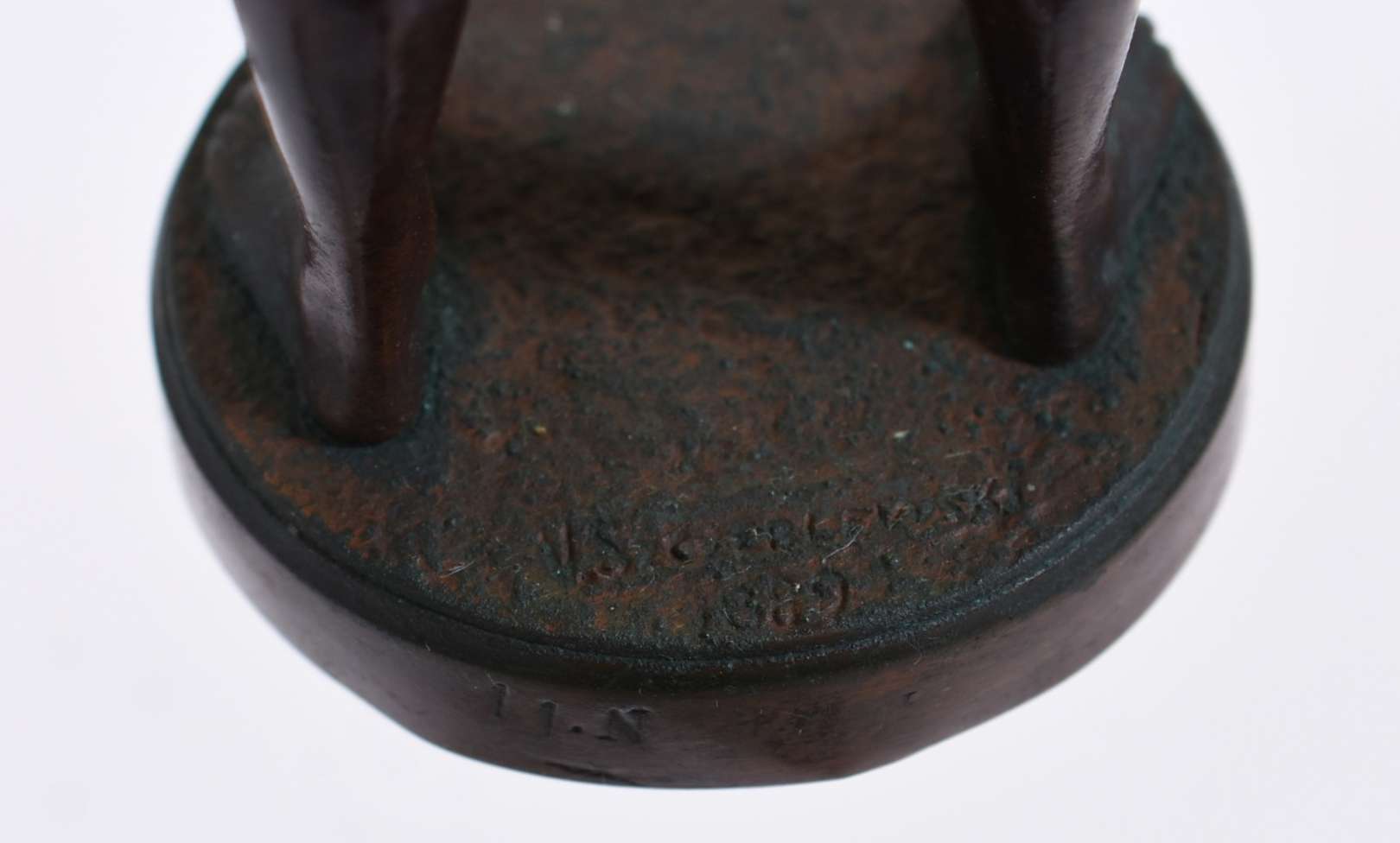 Escultura de petit bronze representando Militar a cavalo, base de madeira com desgastes na pátina.