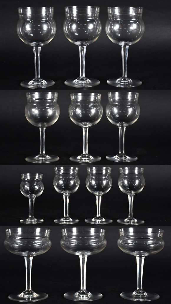 Conjunto de cristal frances lapidado composto de: 9 taças para água (1 relapidado na borda), 18 para vinho tinto (1 c...