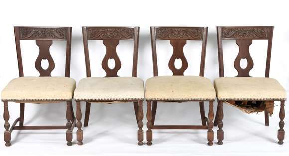 Quatro cadeiras de madeira nobre com encostos entalhados e traves verticais vazadas, assentos estofados (estofado com...