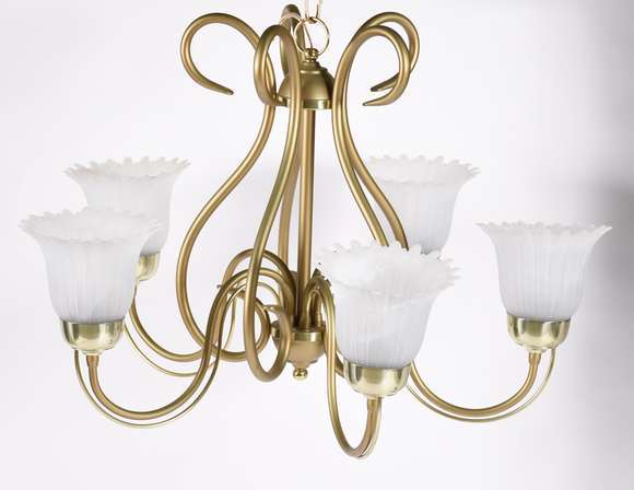 Lustre de metal dourado para cinco luzes, mangas de vidro branco leitoso.