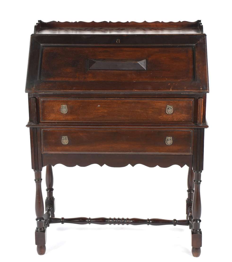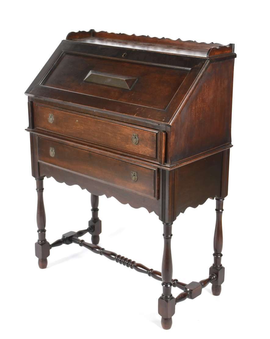 Par de antigas mesas laterais de madeira nobre, saias ricamente entalhadas, pernas cilíndricas ligadas por traves inf...