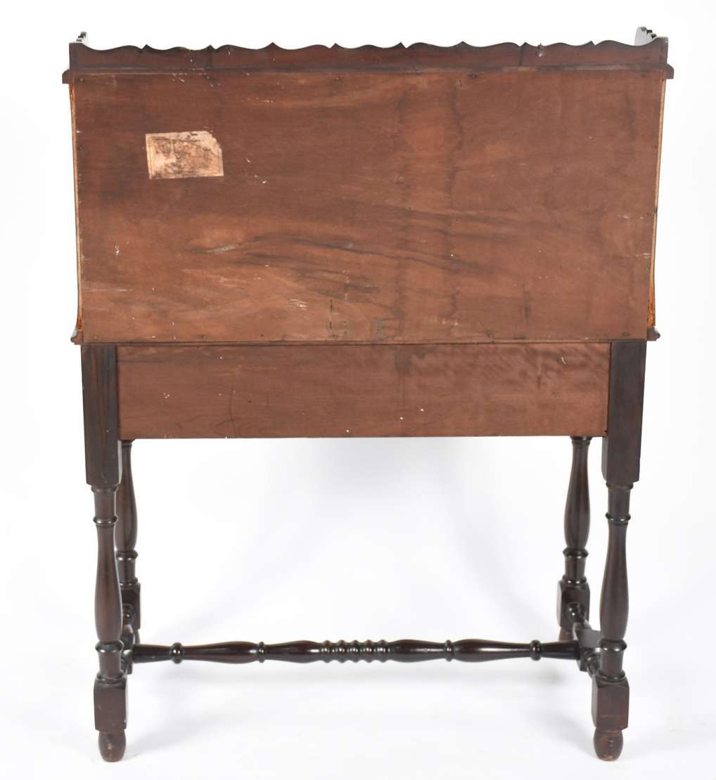 Par de mesas auxiliares de madeira nobre, uma gaveta cada e alçadas com laterais em treliças, pernas cilíndricas, est...