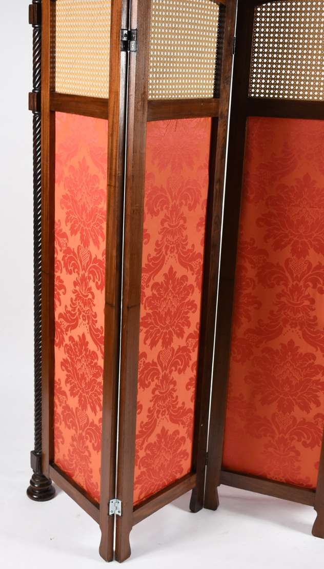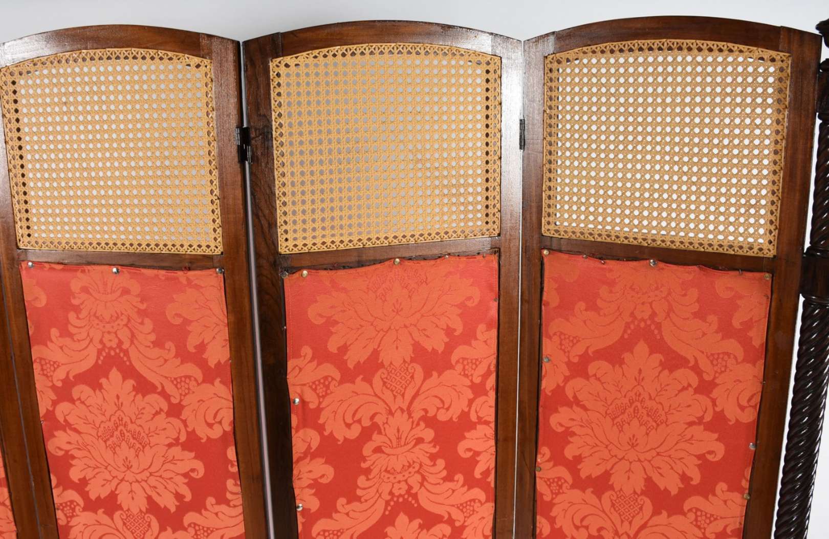 Quatro cadeiras de madeira nobre com encostos entalhados e traves verticais vazadas, assentos estofados (estofado com...
