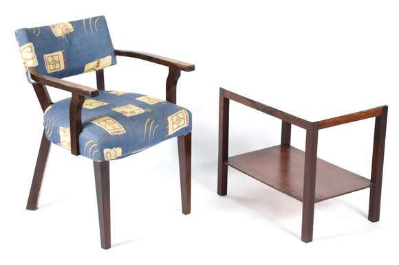 Duas peças diversas, sendo cadeira com braços de madeira nobre, assento e encosto estofado e forrado com tecido estam...