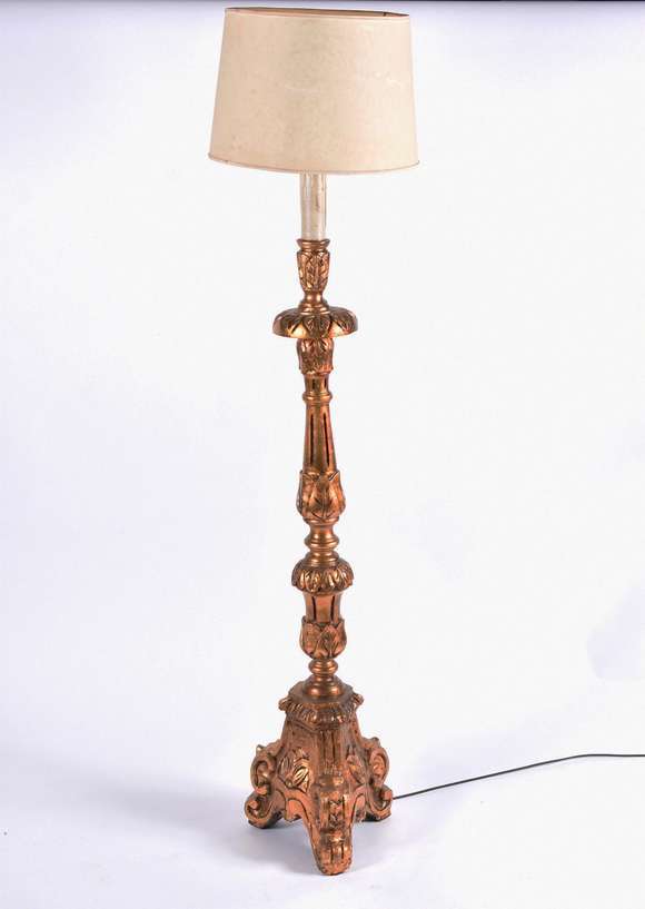 Tocheiro de chão de madeira nobre ricamente entalhada e folha de ouro.