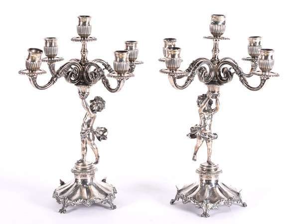 Par de excepcionais candelabros de prata contrastada para 5 luzes cada, apresentando figuras de "Pucci" sustentanto a...