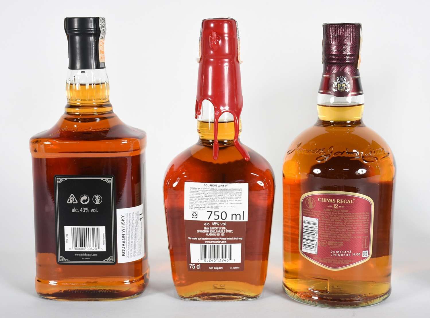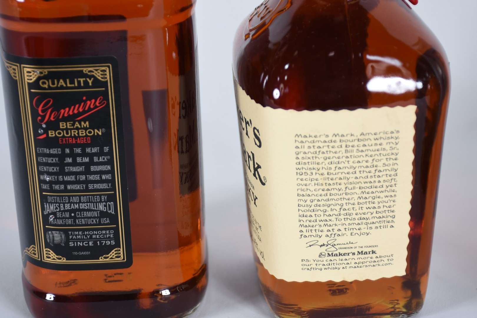 Três garrafas de whisky, sendo Jim Beam, Makers Mark e Chivas.