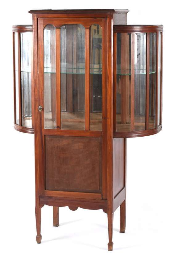 Cristaleira de madeira nobre, porta central e alçadas laterais de vidro bisotado, fundo espelhado.