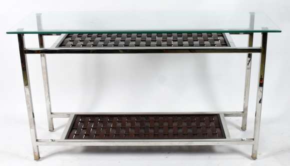 Aparador de metal e vidro, detalhes com dois platôs de fibra entrelaçada.