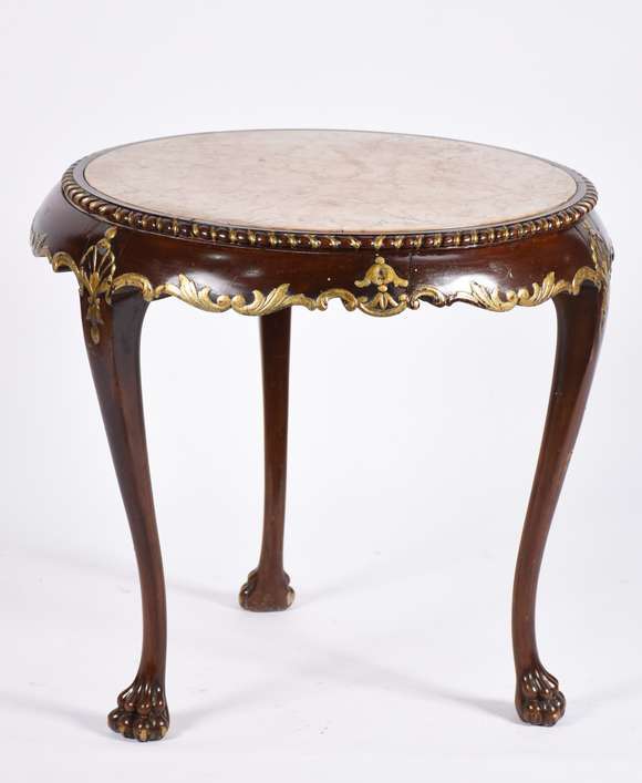 Mesa auxiliar de madeira nobre feitio redondo, saia recortada com realces dourados, tampo de mármore, pés de garra.
