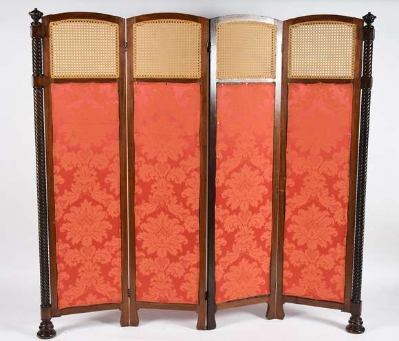 Biombo de madeira nobre com colunas torneadas nas extremidades, quatro folhas forradas com tecido adamascado laranja ...